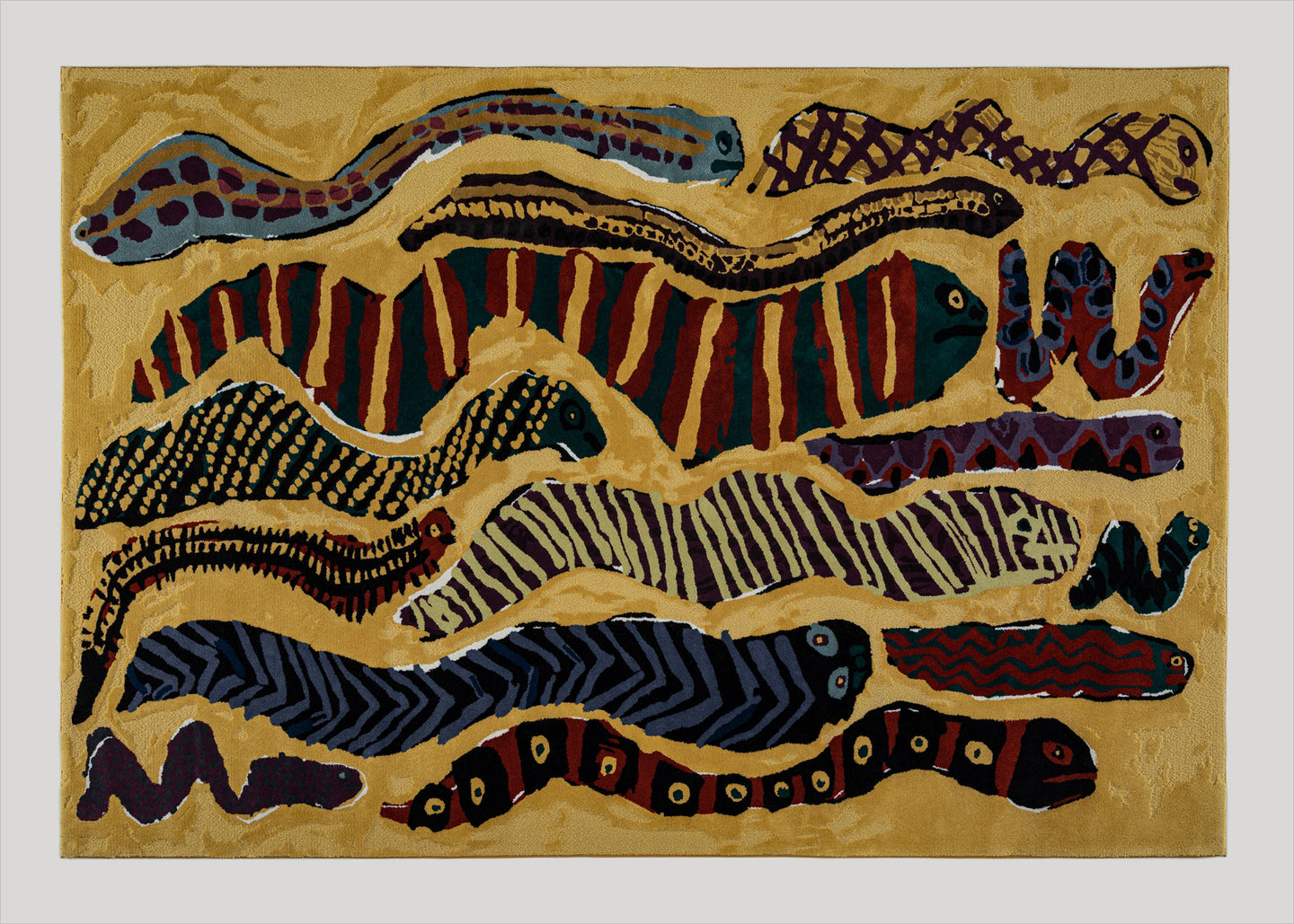 The Slithering Snakes rug belongs to the “Instinct” collection, showcased during Milan Design Week 2025 at the prestigious Rossana Orlandi gallery.