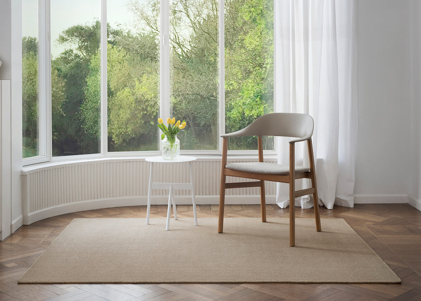 Inspired by jute weavings, our traditional line of Maxima carpeting is now also available in a rug format. The aesthetic and technical characteristics of the yarns make Maxima a great choice. The bouclé weave provides a soft and comfortable feel underfoot, while the edges are finished with reinforced stitching to bind the weave. Maxima rugs are produced using synthetic fibers, for greater resistance to wear and richness of color. These fibers also contribute to increasing thermal insulation and sound absorption. The line is available in a variety of neutral tones that combine easily with your interiors.